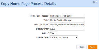 - Edit the existing home page properties to reflect the content of your new home page. Minimally, you will want to change the Home Page Process. Note that it may be desirable to have two process records pointing to the same descriptor so as to manage roles differently. In this case, you can use the same descriptor for both the source home page and new home page.
