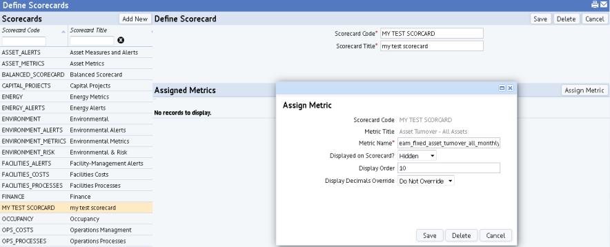 To add a metric to the scorecard, choose Assign Metric and complete the form with the scorecard and display order. Note the following fields: