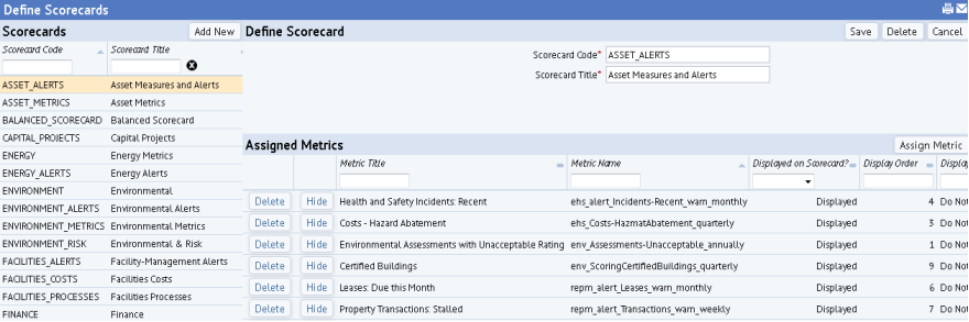 afm_metric_scards.display_order) field governs the order in which the metrics are displayed on the home page scorecard. The higher the value, the lower the metric is displayed on the scorecard. - A metric can be assigned to multiple scorecards. The Displayed on Scorecard