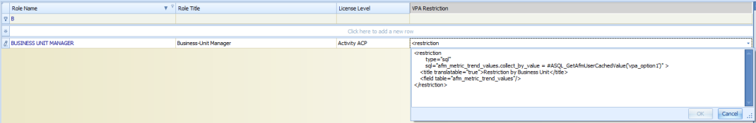 If you collect data at different levels of granularity, you can restrict particular users to just results totaled to that level. For instance, suppose you wish to collect metrics at the business unit level and display them on the home page for your business unit managers. You can use a VPA to restrict the metric trend values data to just the records that should appear. The text below walks through an example for the metrics scorecards, but the same principle also applies to metrics charts.