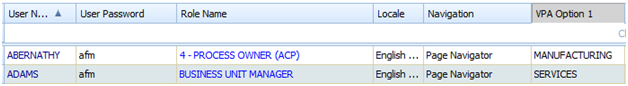 In the Archibus Users (afm_users) table, enter the user's Business Unit Name in the VPA Option 1 field so that you can use the same VPA restriction and role name for different Business Unit managers.