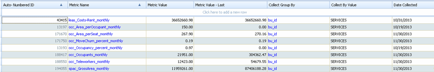 - Metrics such as Occupant Density (occ_Density_monthly) do not display because they do not satisfy the VPA restriction. Since they have only the "all" granularity, they have no value at the Business Unit level and so display as zeros. These values remain in this example for illustration. In production, you would remove these metrics from the scorecard for Business Unit Managers so these metrics would not display at all; since if they have no Business Unit granularity, they have no relevance at the Business Unit level.
