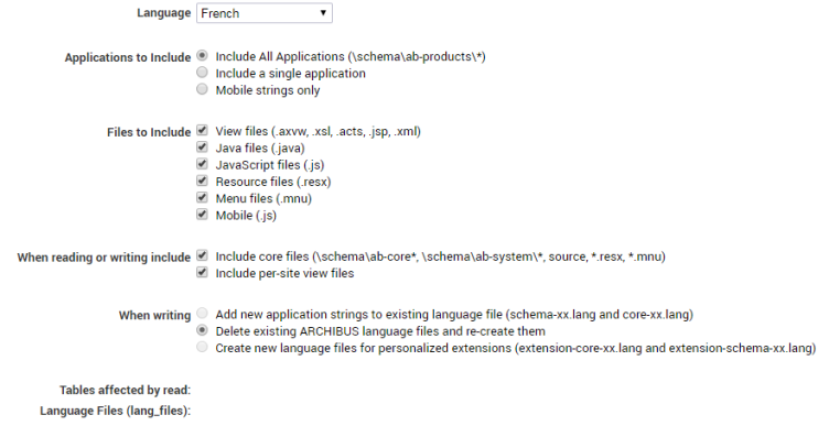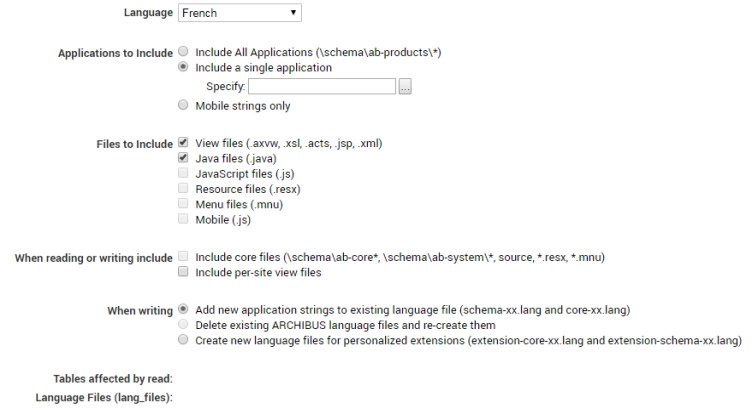 - If you select to include a single application, you can select to add new application strings to existing language files, or to create new language files. Creating new language files enables you to keep your translated strings separate from those provided by Archibus, so that you can upgrade your Archibus core and applications separately from your own extensions.