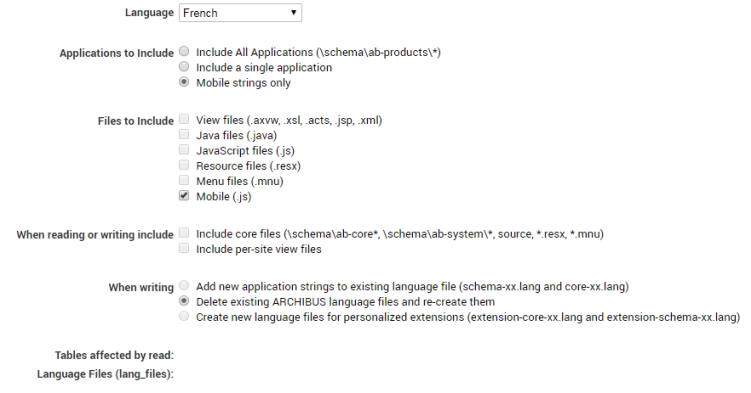 - If you are translating Archibus mobile apps, make sure that you select the "Mobile (.js)" checkbox.