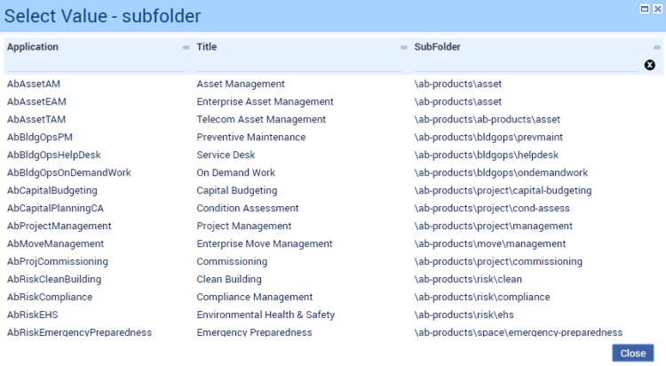 In the Select Value - subfolder pane, where you specify a single application, all but one of the available options map to webcentral-application folders. The exception is \ab-products\system-administration, which is handled as a special case.