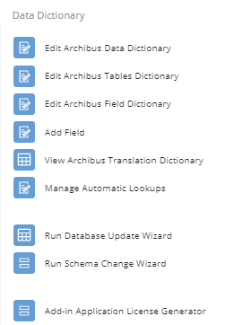 The System / Add-in Manager process contains these tasks for managing the Archibus Data Dictionary.