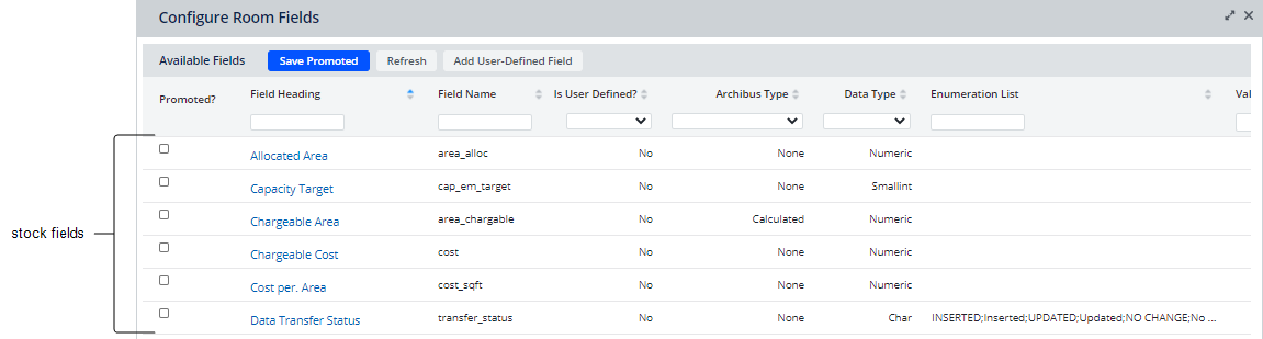 A field that is defined in the Archibus Fields table in the Archibus standard schema. Although the field is available and defined, a view might not offer it for display or editing. With the View Configuration feature, you can promote a stock field to make it available to a select set of views supported by the Configure Fields feature.