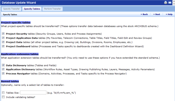- Specify Tables = Select all Project Specific and all Application extension file types as shown below.