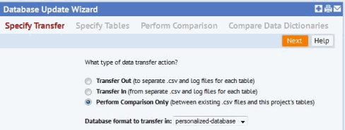 Use the Database Update Wizard's Perform Comparison Only option to compare the contents of an existing CSV file to the corresponding table in the database. There are three types of comparisons: