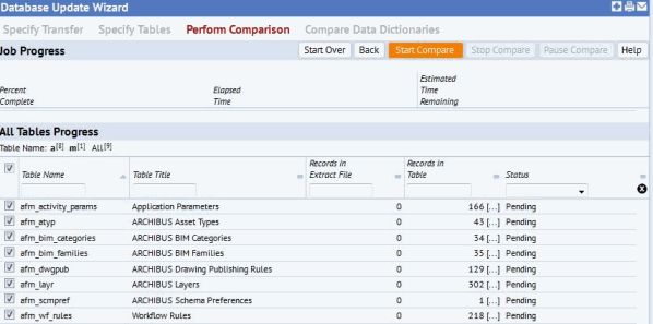 | Compare Schemas | Compare a project database's schema against a standard Archibus schema and give a detailed list of the differences. These differences are recorded in the file SchemaDiff.log. |
