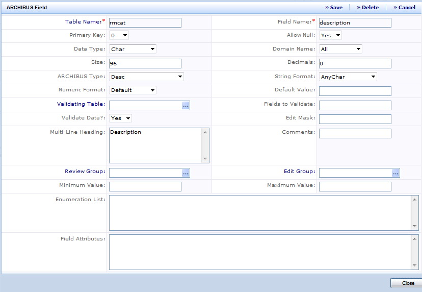 - The Archibus Data Dictionary (this project’s Archibus Fields table, afm_flds)