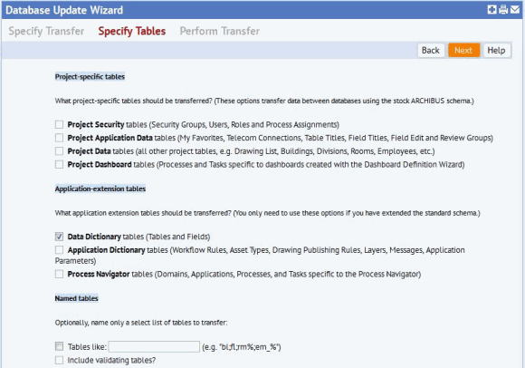 To access the features for merging the data dictionary, you must choose to transfer in Data Dictionary tables when specifying the tables with which to work. The Database Update Wizard prevents you from selecting other types of tables so that it can present the forms specifically required for working with the database dictionary.