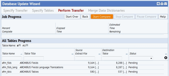 These are the differences that would be implemented if you run the Schema Change Wizard. (There is no need to ever compare the extract file to the SQL database tables – you will always read the extract files into the afm_flds and afm_tbls tables before running the Schema Change Wizard.)