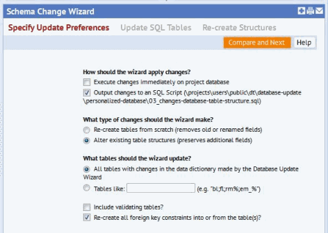 After starting the Schema Change Wizard, you will need to answer a series of questions that determine how the update will take place.