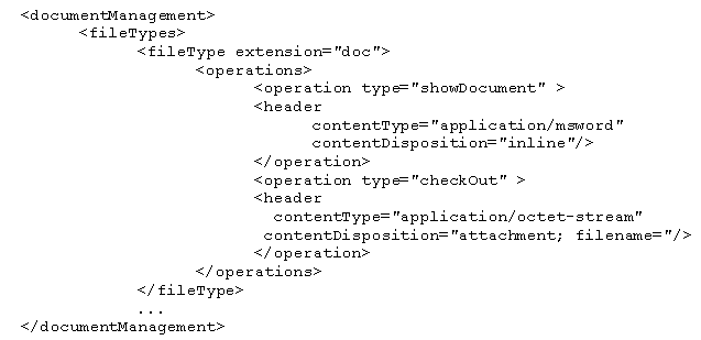 The documentManagement section of the ..\Afmxx\tools\tomcat\webapps\archibus\WEB-INF\config\context\compatibility\afm-config.xml file specifies which types of files users can check in and out of Archibus and how they should be displayed when downloaded.
