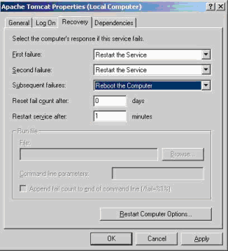 The service manager also gives you the option of having Tomcat restart the application server (and thereby restart Archibus Web Central) or even restart the computer should it encounter an error.