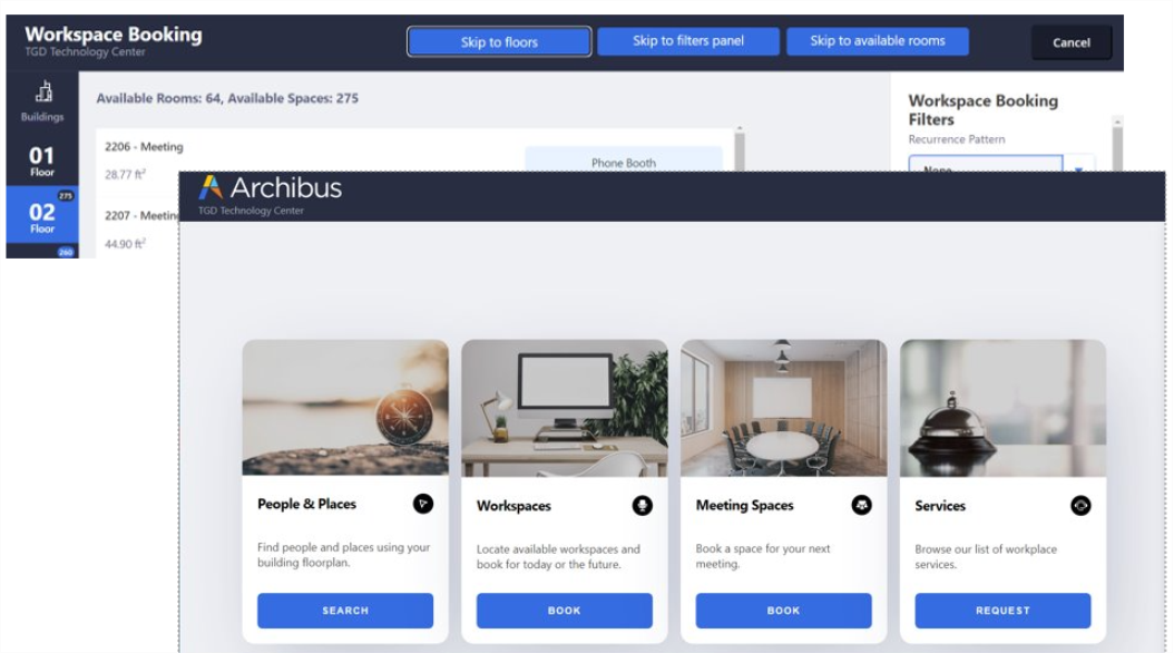 You may recall that Archibus V.2022.02 introduced a new user dashboard. This interface element is not yet part of the VPAT, although testing is in progress. Therefore, for V.2022.03, when accessibility mode is active, the Service Catalog URL (https://domain(:port)/archibus/workplace?action=servicecatalog) follows the same behavior as it does in V.2022.02: it does not redirect to the new user dashboard, as it does in non-accessibility mode.