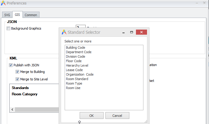 If you are publishing rooms, you can select a list of one or more standard categories by which the KML should thematically render the output. The KML publishing will produce one KML file per floor, building or site for each standard category you select. Choose the Add button in the KML section to access the Standard Selector form from which you can choose a standard category.