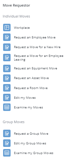 You can request employee moves, equipment moves, asset moves, or room moves. These moves can be: