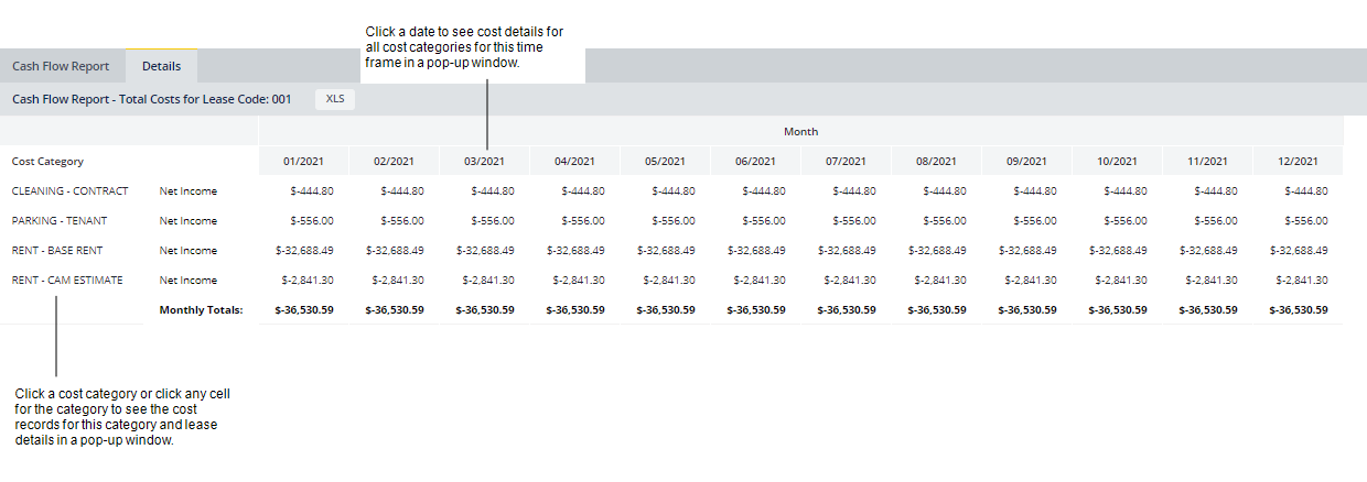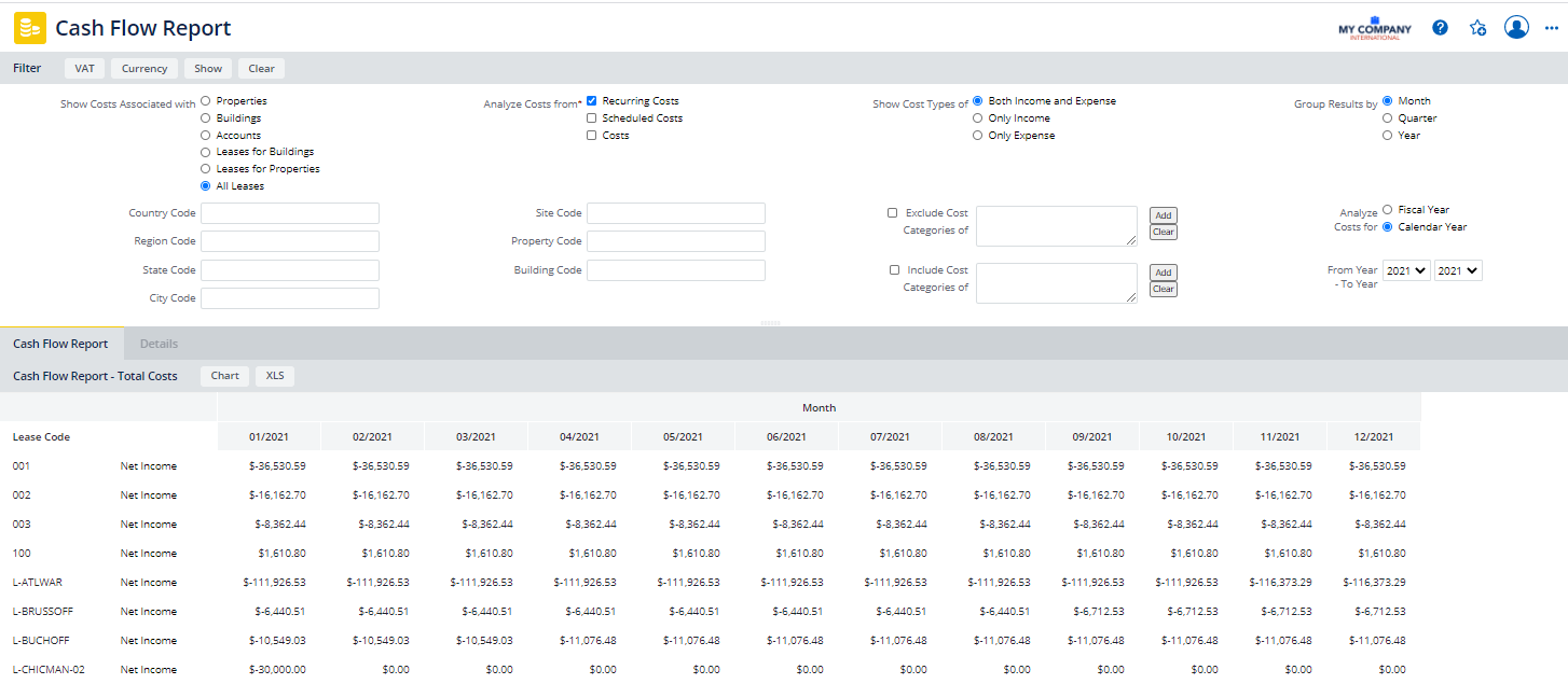 The Cash Flow report summarizes your costs as net income by properties, buildings, leases, or accounts for the time period you select. The report provides monthly, quarterly, or yearly cost totals for all portfolio items included in the report, and totals for each portfolio item. The costs are summarized so that you can easily view them on one screen, a useful feature for large portfolios spanning multiple countries. You can then drill down in the summary to the Details tab that shows the break down of costs by cost category; from the cost categories, you can drill down to see all cost records for that category.