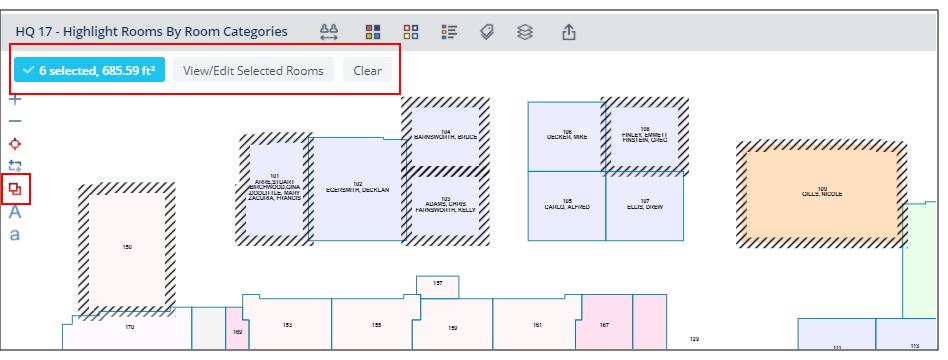 - If you want to work with multiple assets, set to Select Multiple Assets mode by clicking the Select Multiple Assets button in the floor plan's icon list on the left. The button turns red when in this mode.