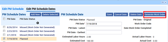 - Select the new Planned PM Schedule Date and click the Generate Work Order button. The system generates a single work order.