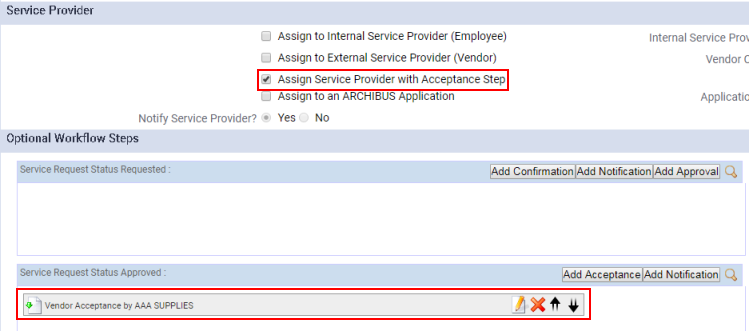 - Choose the Assign Service Provider with Acceptance Step option in Service Provider section of the Response Parameters tab. The system presents a pop-up form (shown below) for setting the vendor or employee and setting other options. Once you complete the form, the acceptance step is listed in the Optional Workflow Steps section. This scenario is shown in the below image. You can then edit the acceptance step, if necessary, by accessing the form using the button in Optional Workflow Steps.