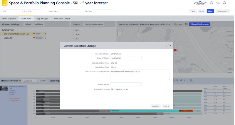 - Open the Space & Portfolio Planning Console, select a scenario, move to the Stack Plan tab, and display the stack plan for the selected building. If you plan on moving allocations between multiple buildings or ot the Unallocated building, be sure to display the stack plans for these buildings.