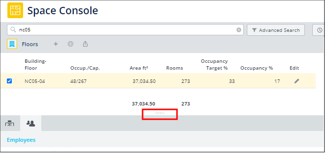 You can reinstate the Floors list by clicking on the dotted line on the splitter that is positioned above the Space and Occupancy tabs. Displaying the Floors grid can be important for seeing key information about the floor or for accessing the Edit icon for editing floor information.