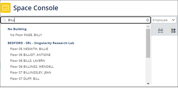 If an employee does not have a building or floor, the search box will state "No Building for XX" or "No Floor for XX". You can still select the employee from the search results so that the Space Console displays in the employee list, where you can edit the record.