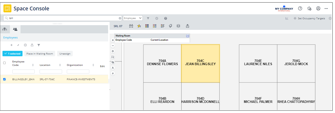 The Space Console lists this employee in the Employees tab. It loads the floor plan and highlights and zooms into the employee's room on the floor plan. For example, clicking on "BILLINGSLY, JEAN" in the search results in the above image, loads the SRL-07 floor plan and highlights and zooms into Jean Billingsly's assigned room.