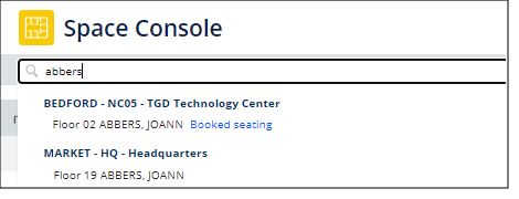 Select the employee with a booked seat from the search results, and in the floor plan the Space Console lists the employee's name in the booked room. This differs from the behavior for permanently-located employees, for which the Space Console highlights the room in the floor plan as described above.
