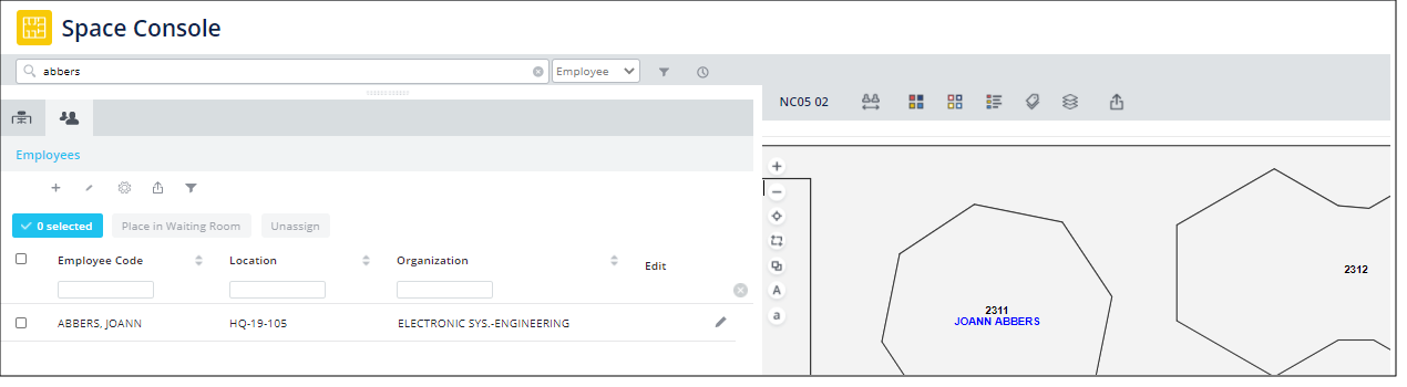 When you search for an employee, the Space Console sets to Occupancy mode and highlights the employee's room on the floor plan.
