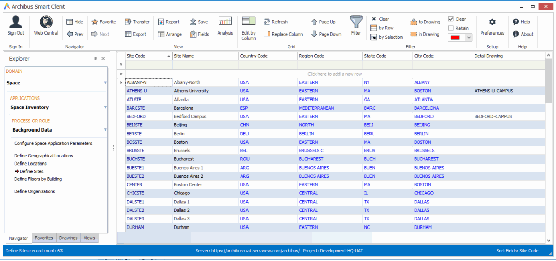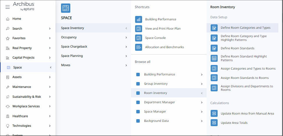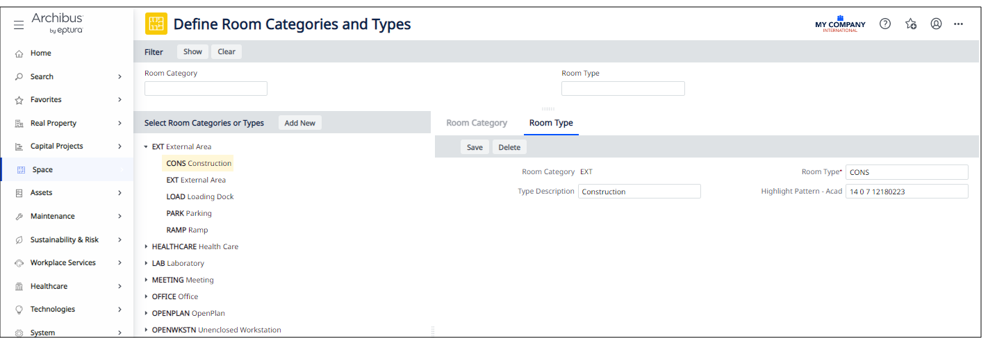 For example, select the Space / Space Inventory / Room Inventory / Define Room Categories and Types task from the Navigator in Web Central,