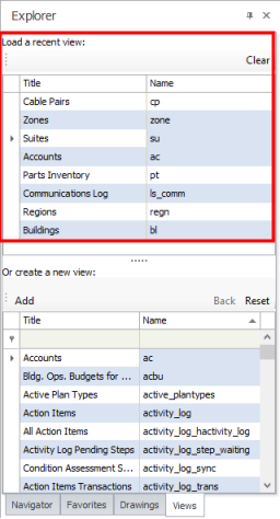 When you work with the Views tab to load tables and create new grid views, the Smart Client automatically displays each new grid view that you create (up to 8 views) in the Recent Views list at the top of Explorer pane. From the Recent View list, you can click on an entry to quickly reload the view with the settings you specified.