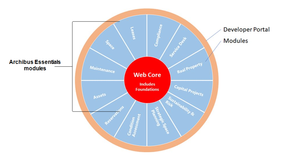 The complete set of Archibus modules. After working with Archibus Essential modules to manage basic aspects of the facility, a site can advance to other modules, such as Lease Chargeback or Energy. Almost all Archibus business solutions are offered as modules. Only a few of the less-frequently used non-SaaS solutions are not offered in Archibus SaaS. These are: