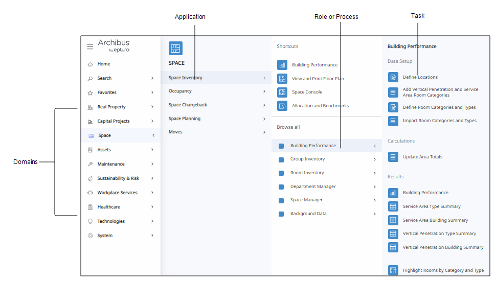 As shown below, a Non-SaaS user might start with a general facility area (the Space domain), a goal within this area (Space Inventory application), choose their role within the application (Space Manager), and then choose from a list of tasks for this role. Instead of a role, you sometimes choose a process, such as Building Performance or Background Data.