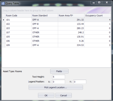Invoke the Query Table command, select a set of room asset symbols, and the command displays, in the Query Table dialog box, the records in the Rooms asset table that link to the selected asset symbols. You can vertically and horizontally scroll the dialog box to review the data. The default view's field visibility settings determines the fields that the Query Table command presents. Use the Fields option to change the field visibility and set the exact set of fields from the Rooms table that you want to display. When through, press the OK button to close the dialog box.