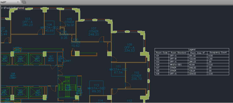 The below image shows the results of selecting seven room asset symbols in the HQ19 sample drawing and using the Fields option to add the Occupancy Count and Room Area fields to include in the table.