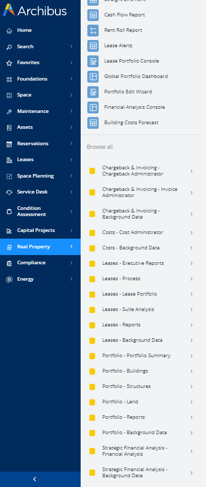 Domains are areas of practice organized by the building lifecycle: Real Property, Capital Projects, Space, and so on. Each domain consists of a series of applications. In the Archibus SaaS offering, all modules are presented at the Navigator's application level and the domain level is not used. |