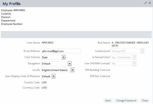 In general, you should not change the other options listed on the My Profile form. Contact your system administrator for information on changing Email Address, Role Name, VPA Building Code List, and VPA Site Code List.