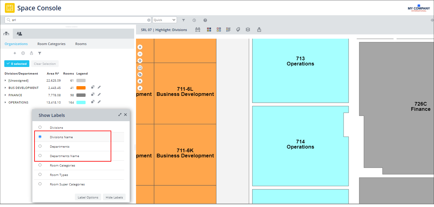The Space Console now takes advantage of these descriptive fields. From the Show Labels option, you can choose the Division Name and Department Name fields and display these descriptive labels with mixed case on the floor plan when you highlight. Taking advantage of these fields is especially important if you export your floor plan to users who might not be familiar with the Division Code and Department Code identifying values; these users will appreciate the descriptive names displayed by the Division Name and Department Name fields.
