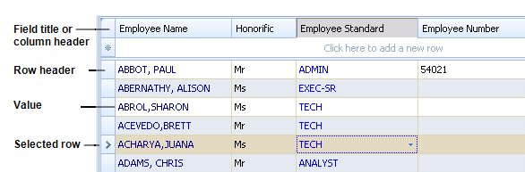 Within a table, information is organized into rows and columns so that it can be quickly retrieved. A table's columns, known as fields, store categories of information. For example, a column of employee phone numbers in an Employees table, a column of building names in the Buildings tables, and a column of area measurements in the Rooms table are all fields. The individual items in each column are know as values, such as the name of a particular employee in the column of employee names.