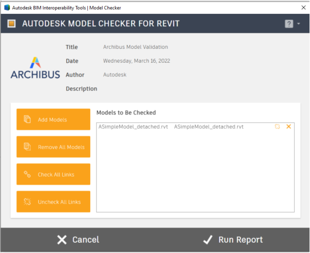 In the resulting form, you can choose to check just the current model or multiple models, and also choose to check links. For information, see the Autodesk video: Model Checker for Revit - Running Checks.