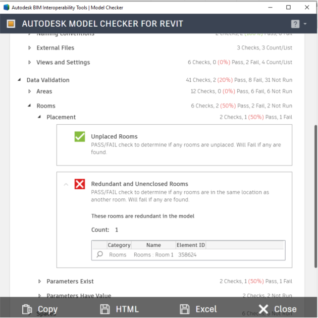 Drill into the report for specifics on the errors that the check encountered. For example, expand the Data Validation / Rooms section, and you can see the specific rooms that are not enclosed. Click on the element ID, and you move to this element to correct the problem. Once you correct the issue, run the Model Checker again and verify that the issue is, indeed, corrected. See the Autodesk Model Checker for Revit - Running Checks video for details.