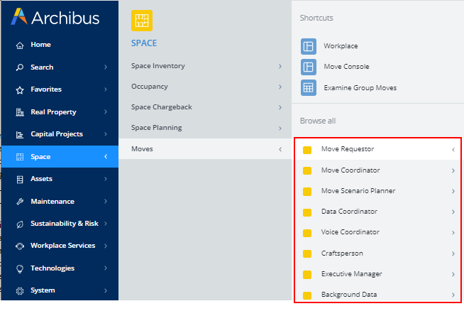- The image shows all processes and roles for the Moves application because the current user (sample user AFM) has access to all roles and processes. However, through security, you can configure Archibus so that when a user signs in, they see only the tasks appropriate for their role. For example, the Move Requestor sees only the Move Requestor selection and its tasks. This approach simplifies the software, increases data security, and reduces training.