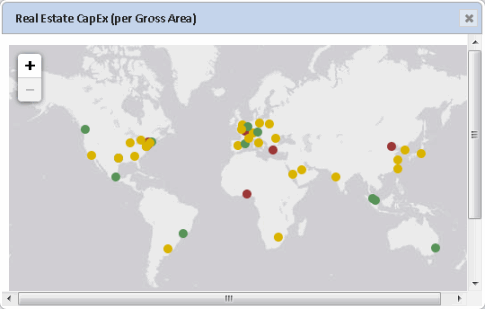 If a building or site has been geo-coded, you can see the location of these items on a map. From the menu, choose a "by Location" option, such as "by Site Location" and the system presents in a pop-up window a map with markers indicating the location of the sites contributing to the metric. The map markers use the same stop-light colors so that you can easily locate the on target, warning, and critical sites. You can zoom the map and hover over a marker for the site or building name.
