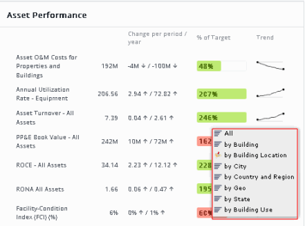For example, on the Assets home page, choose "by Building" menu option for the Facility Condition Index metric, and you receive the below pop-up detailing the Facility Condition Index values for each building.