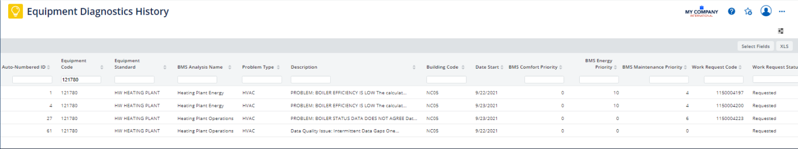 Use the Smart Search Console to filter by Equipment Code to show a history of imported diagnostics for the equipment. For example, the below image shows the diagnostics for item 121780.