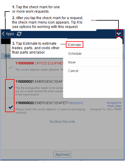 - From the Approved tab, tap the check mark for a work request, and then tap the check mark menu icon that appears. You can select multiple work requests if you are adding the same estimate for each of them.